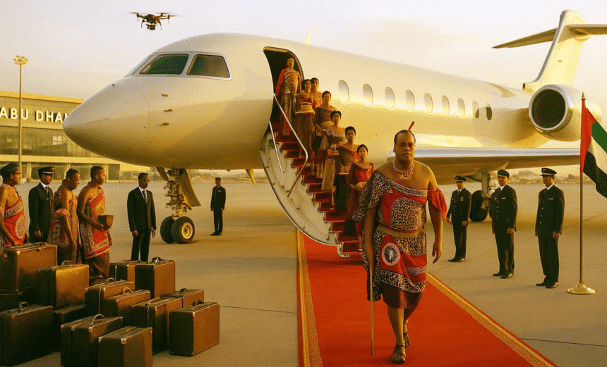 The arrival of King Mswati III, the ruler of Eswatini, in Abu Dhabi has created a global stir after footage surfaced showing the monarch landing in the UAE with 15 wives, 30 children, and over 100 servants. The king’s lavish entrance aboard a private jet drew widespread attention and sparked heated debate about royal extravagance, leadership, and inequality in the small southern African kingdom. The video, originally recorded in 2022 but resurfacing online in mid-2025, shows the royal procession descending from the aircraft in striking traditional attire as aides and attendants managed dozens of suitcases and security personnel cleared the tarmac. Airport officials in Abu Dhabi reportedly closed off several terminals to accommodate the massive entourage.