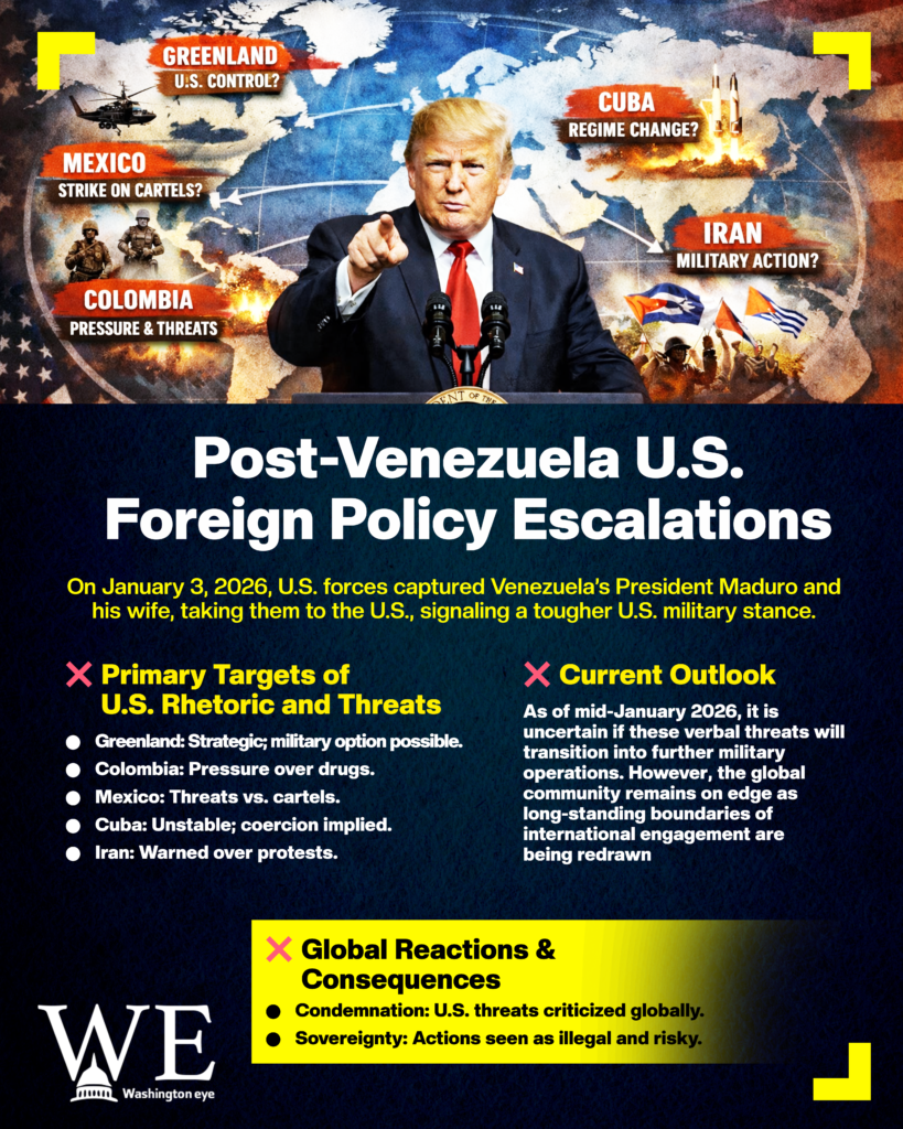 As of mid-January, it remains unclear how far Trump’s threats will escalate into actual operations beyond Venezuela. But world capitals from Bogotá to Copenhagen are watching closely, bracing for possible shifts in U.S. policy that could redraw long-standing boundaries of international engagement and put sovereign states on edge.