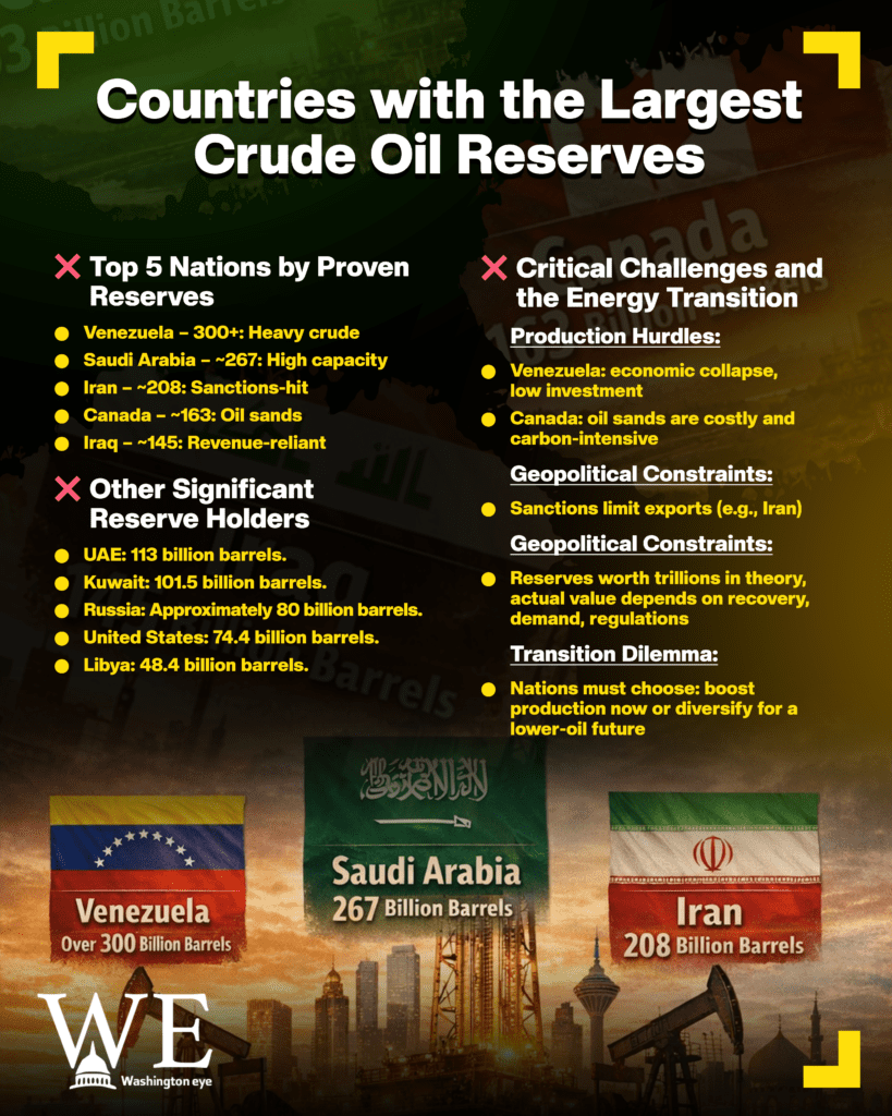 Venezuela tops the list, holding the world’s largest proven crude oil reserves at over 300 billion barrels. Most of this oil lies in the Orinoco Belt and is classified as heavy or extra-heavy crude, which is costly to refine and transport. Despite its vast resource base, Venezuela’s production has been constrained for years due to economic collapse, lack of investment, sanctions, and political uncertainty. As a result, its enormous reserves translate into potential power rather than immediate market dominance.