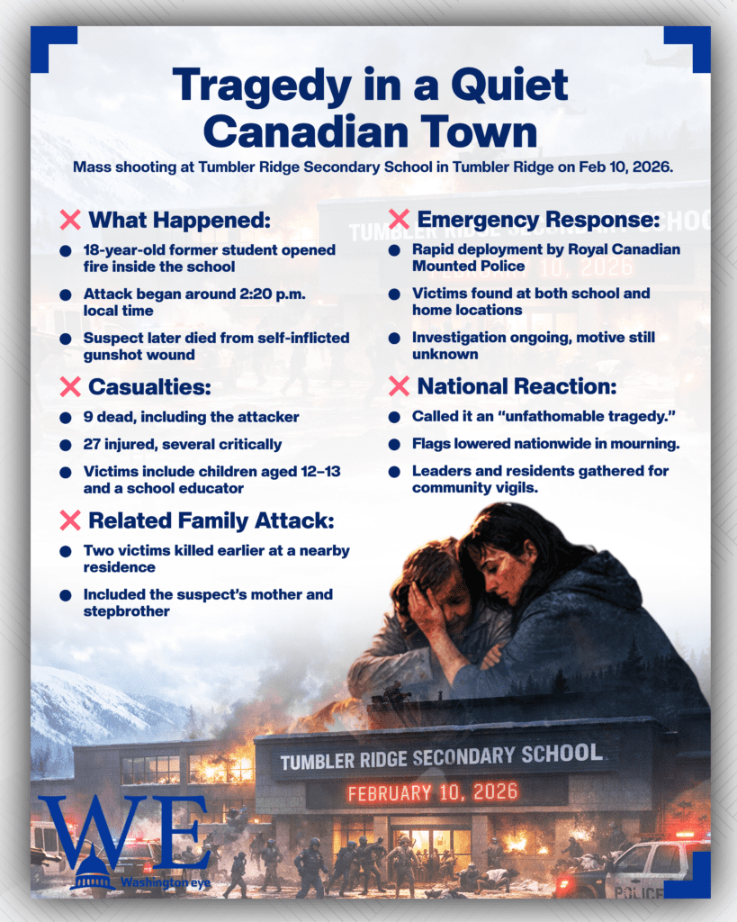 A remote mountain community in northern British Columbia was plunged into mourning on Tuesday, February 10, 2026, after a mass shooting at Tumbler Ridge Secondary School left multiple people dead and dozens injured in one of the worst acts of violence in Canadian history. The tragedy began shortly after 2:20 p.m. local time (MST) when an 18-year-old former student walked into the small public school and opened fire, sending students and teachers into lockdown and sparking a frantic emergency response.