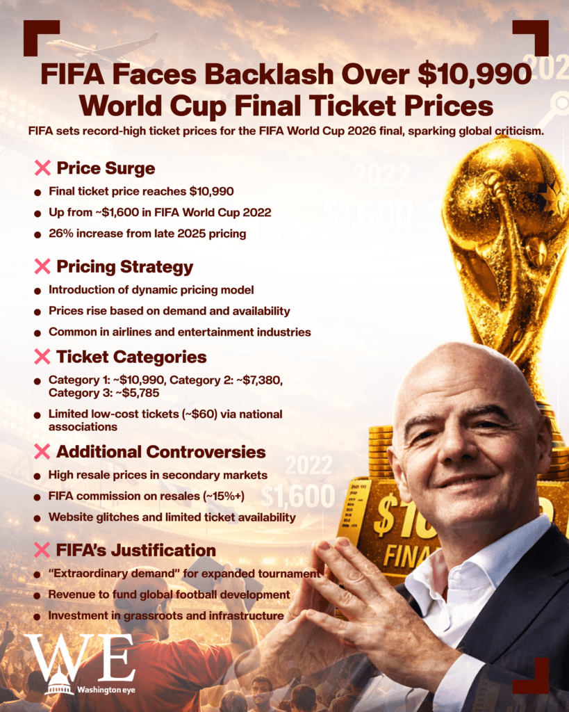 FIFA has attributed the price surge to its newly implemented dynamic pricing model, a system widely used in airline and entertainment industries where ticket costs fluctuate based on demand, timing, and market conditions. Under this model, high-demand matches, particularly the final, see significant price hikes as availability decreases and global interest intensifies. Officials argue that the pricing reflects “extraordinary demand” for what is expected to be the most attended World Cup in history, featuring 48 teams and 104 matches.