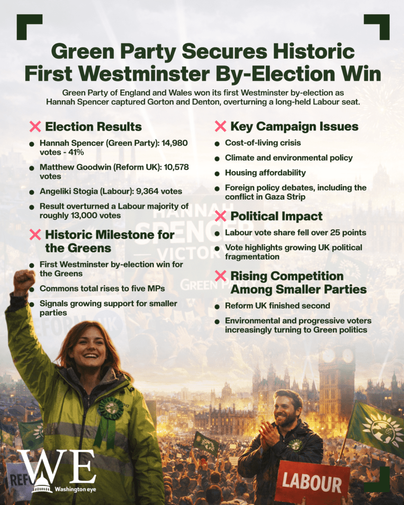 The Green Party of England and Wales has achieved a historic breakthrough after winning its first-ever Westminster by-election, marking a significant shift in British politics and delivering a major setback to the country’s traditional parties. The victory came in the Gorton and Denton constituency in Greater Manchester, where Green candidate Hannah Spencer defeated candidates from Labour and Reform UK in a closely watched contest. The by-election was held in late February 2026, drawing national attention as it tested voter sentiment following recent political debates over economic issues, climate policies, and foreign policy.