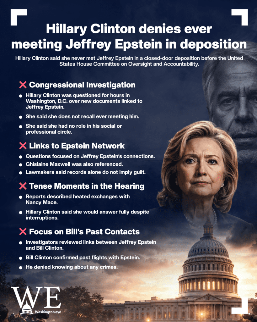 Former United States Secretary of State Hillary Clinton has said she never met convicted sex offender Jeffrey Epstein, rejecting any personal connection with the late financier during a recent congressional deposition linked to the ongoing investigation into Epstein’s network and associates. The testimony has renewed global attention on Epstein’s ties to powerful political and business figures.
