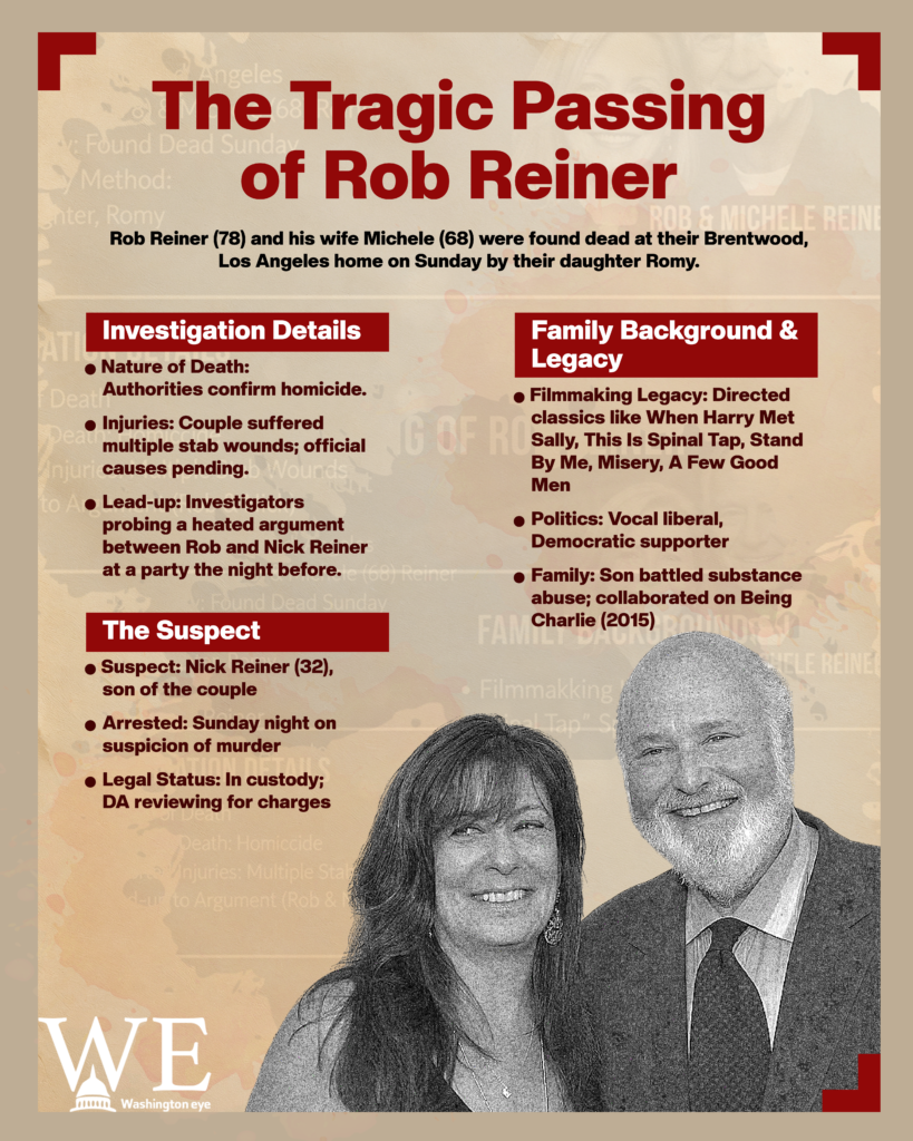 According to sources cited by US media, the bodies were discovered by the couple’s daughter, Romy. Reports indicate that Rob and Michele Reiner had suffered multiple stab wounds, though an official cause of death has not yet been released. Investigators are also examining reports of a heated argument involving Rob and Nick Reiner at a party the night before the deaths. No