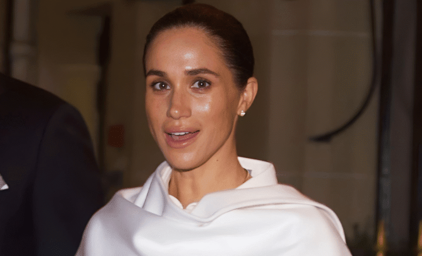 For the show, Meghan wore a dramatic all-white ensemble that quickly became the centerpiece of social media conversation. The look featured a crisp button-down blouse paired with wide-leg trousers, layered under a flowing white cape that swept behind her as she walked. The effect was regal yet modern, a nod to her royal past but firmly rooted in contemporary minimalism. She accessorized the outfit with a black clutch, matching pointed-toe heels, and subtle diamond earrings, while her hair was slicked back into a low bun. The understated elegance drew comparisons to classic Hollywood glamour, a style Meghan has long favored. Makeup artist Daniel Martin, a trusted friend, reportedly crafted her soft, luminous look using hydrating serums and sheer coverage foundation to enhance her natural glow.