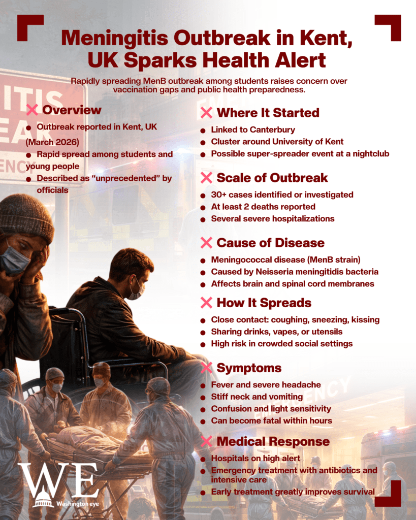 A rapidly spreading outbreak of meningitis has gripped Kent in southeast England, raising alarm among health authorities, universities, and families as cases continue to rise in March 2026. The outbreak, first detected around March 12–15 in Canterbury, has been described by officials as “unprecedented” due to its speed and concentration among young people, particularly students.