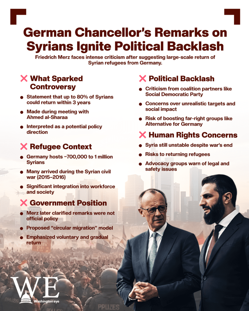German Chancellor Friedrich Merz has come under intense criticism after controversial remarks about Syrian refugees in Germany triggered a nationwide political and social debate, highlighting deep divisions over immigration policy in Europe’s largest economy. The comments were made in late March 2026 during a high-profile meeting in Berlin with Syria’s interim president, Ahmed al-Sharaa, where discussions focused on post-war reconstruction and the future of Syrian refugees.