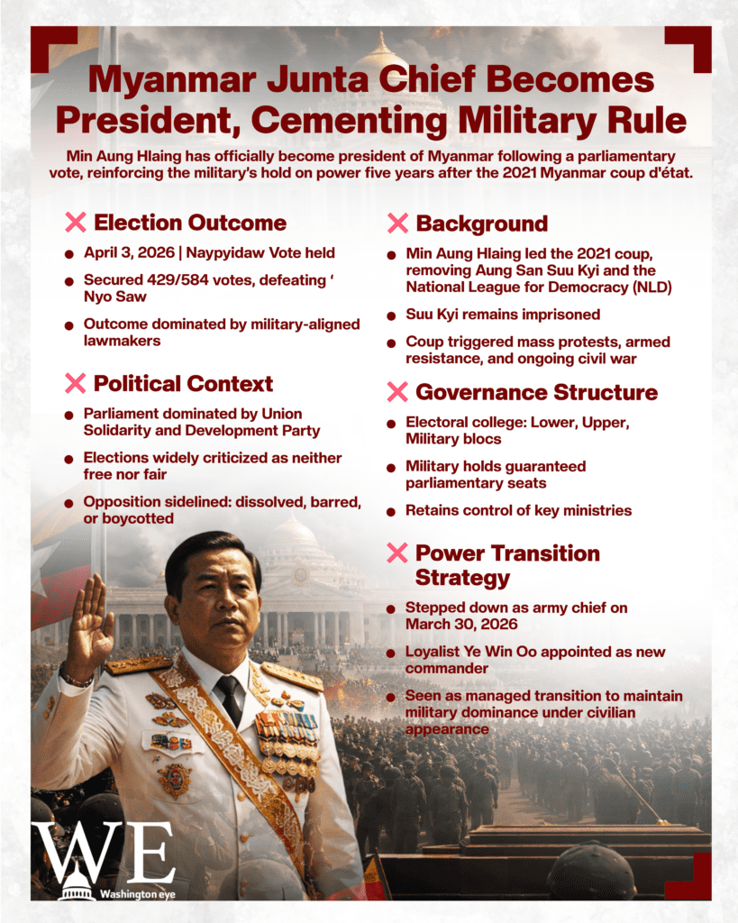 Myanmar’s military leader Min Aung Hlaing has formally become president of Myanmar following a parliamentary vote that critics say cements the military’s grip on power five years after a coup that plunged the country into civil war. The development marks a significant political shift, though analysts argue it represents continuity rather than change, with the armed forces maintaining dominant control over the state.