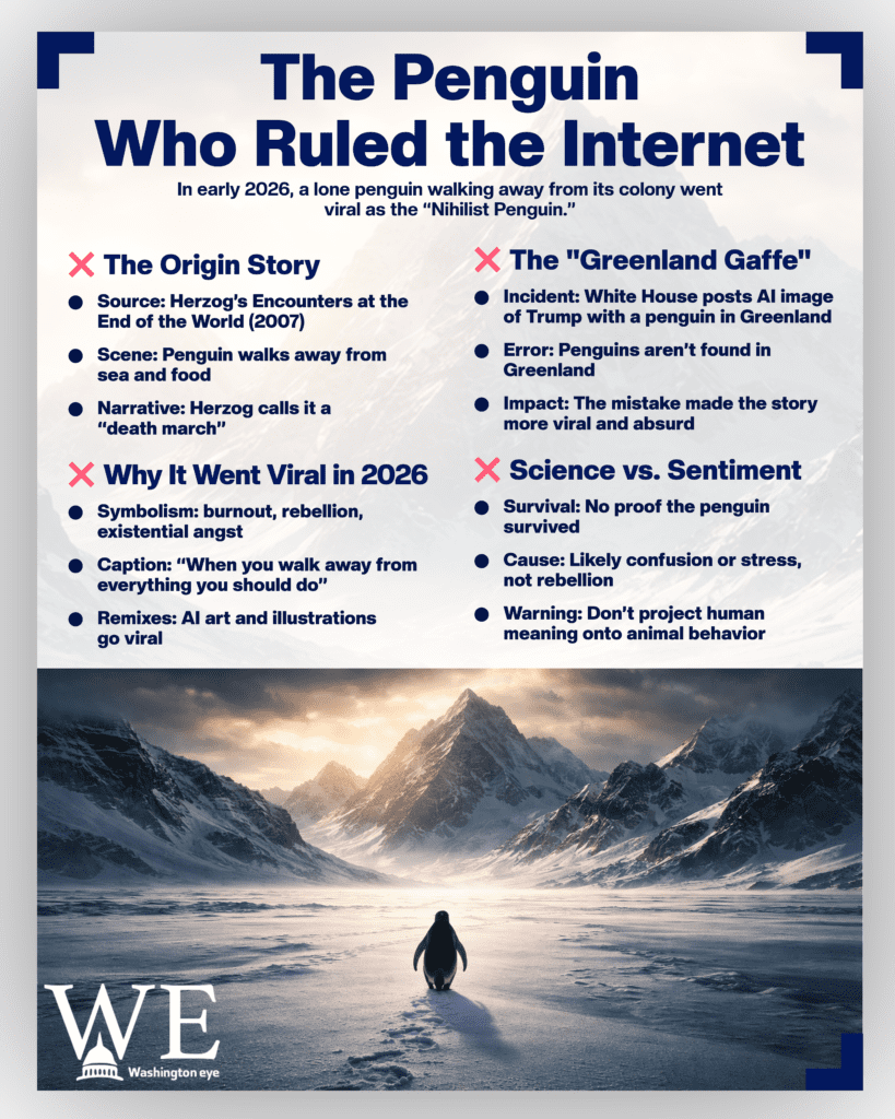 In the first weeks of 2026, a seemingly simple clip of a lone penguin striding across a frozen landscape toward distant mountains has captured the world’s imagination and swiftly become one of the year’s most unexpected viral sensations. Dubbed the “Nihilist Penguin,” this flightless Antarctic bird, whose identity remains unknown, has sparked a global wave of memes, philosophical debate, geopolitical mockery, and artistic commentary, turning what was once an obscure nature documentary moment into a full-blown cultural phenomenon.