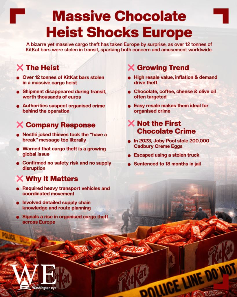 Europe’s KitKat heist: thieves make off with 12 tons, leaving chocolate fans shocked.