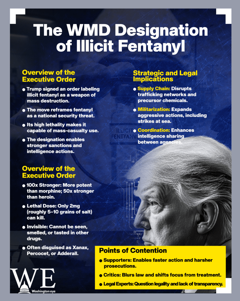 President Donald Trump on Monday, December 15, signed an executive order at the White House designating illicit fentanyl, and a “core precursor chemical” used to make it, as a “weapon of mass destruction” (WMD), a label traditionally associated with nuclear, chemical, and biological threats. The move is framed by the administration as a national-security escalation in the fight against opioid overdose deaths and transnational trafficking networks, and it signals a willingness to bring counter-WMD tools and agencies into what has long been treated primarily as a public-health and law-enforcement crisis.