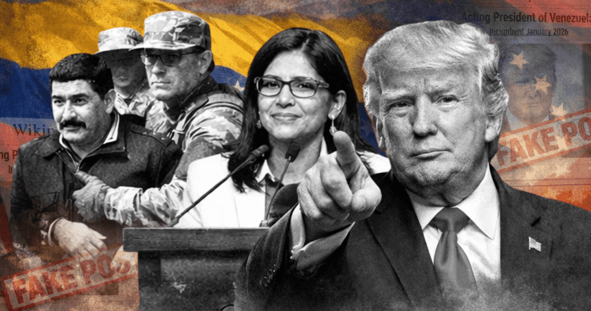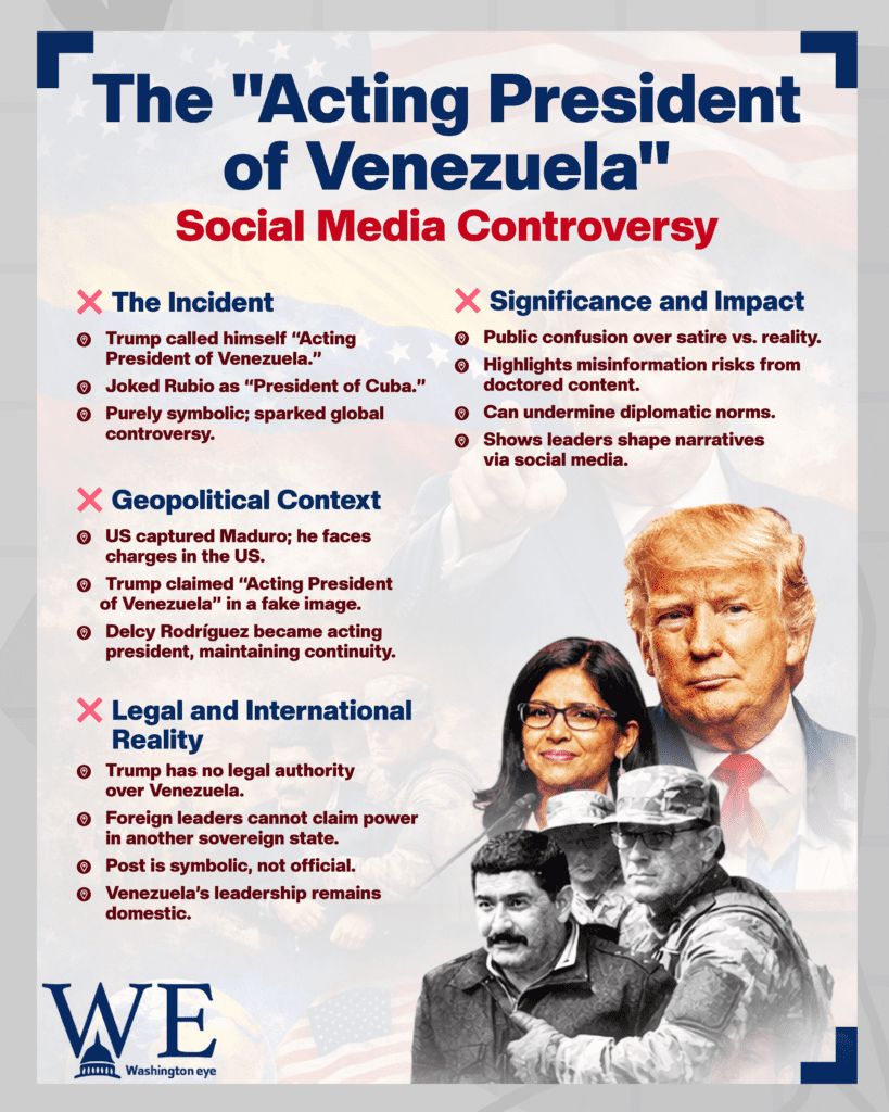 President Trump posted a doctored image on Truth Social styled like a Wikipedia profile naming himself “Acting President of Venezuela, Incumbent January 2026,” a claim with no legal basis after U.S. forces captured Nicolás Maduro; Venezuela’s vice president was sworn in as interim leader, and the post has sparked widespread debate and scrutiny.