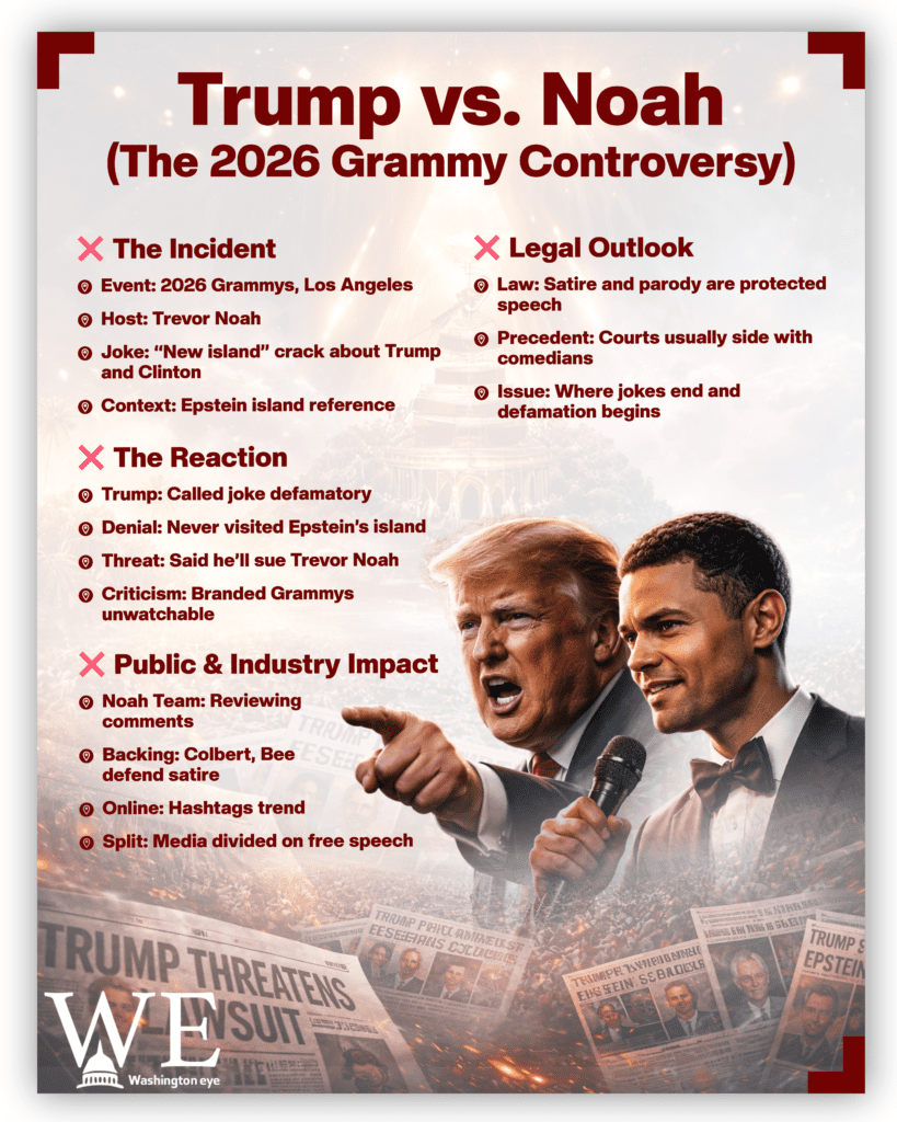 In the wake of the 2026 Grammy Awards ceremony, a sharp public dispute erupted between former U.S. President Donald J. Trump and comedian and host Trevor Noah over a joke made onstage that referenced Trump’s alleged historical ties to Jeffrey Epstein. The controversy, which dominated political and entertainment headlines in early February 2026, underscores how cultural events continue to intersect with broader national debates about power, accountability, and free expression.