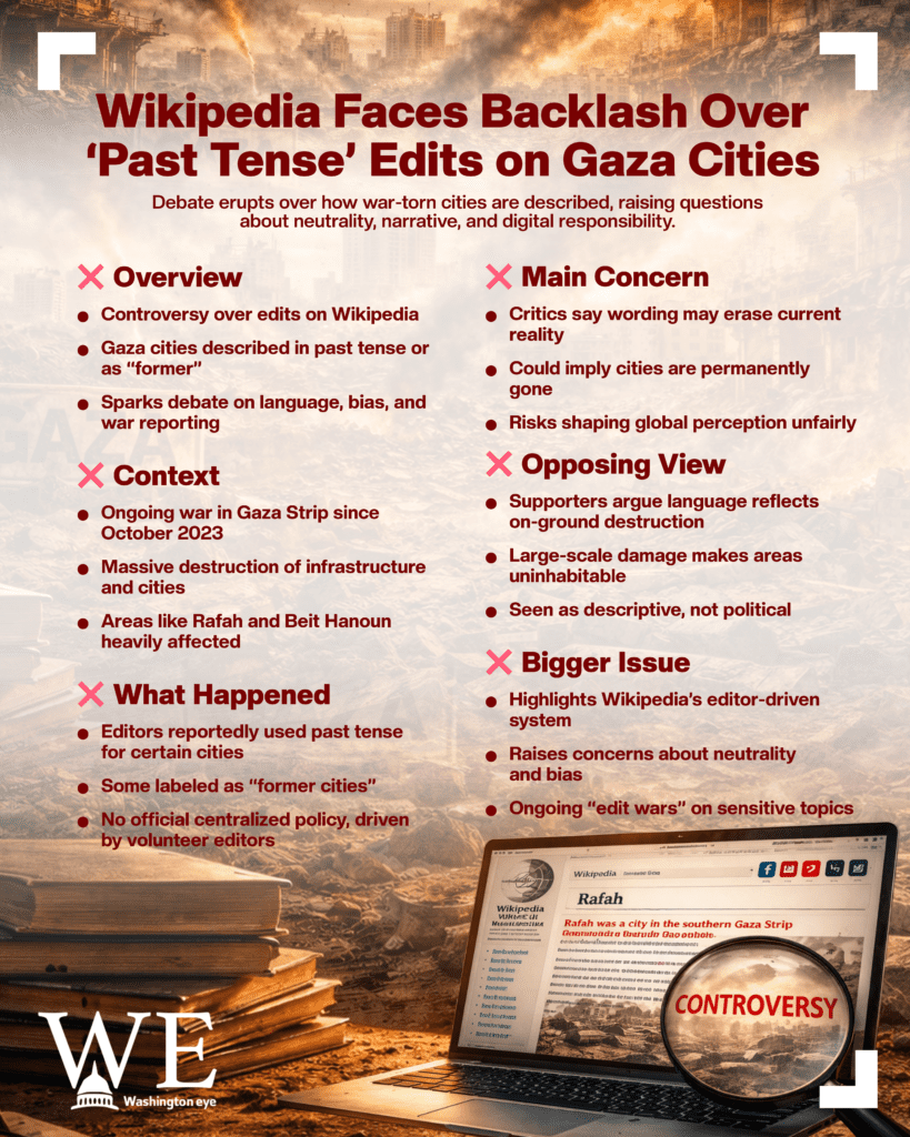 In recent days, controversy has erupted online after claims surfaced that Wikipedia has begun referring to several cities in Gaza in the past tense, describing them as “former” locations. The alleged edits, reportedly affecting cities such as Rafah and Beit Hanoun, have ignited widespread debate across social media, journalism circles, and academic communities, raising questions about narrative framing, neutrality, and the ethics of documenting an ongoing war.